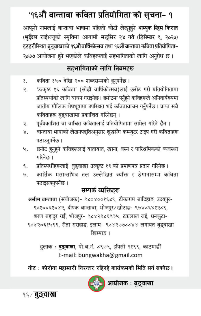 निदुम|अन्य १६औं बुङ्वाखा वार्षिकोत्सवको सूचना By Bungwakha - August 25, 2020 0 128 Share on Facebook Tweet on Twitter