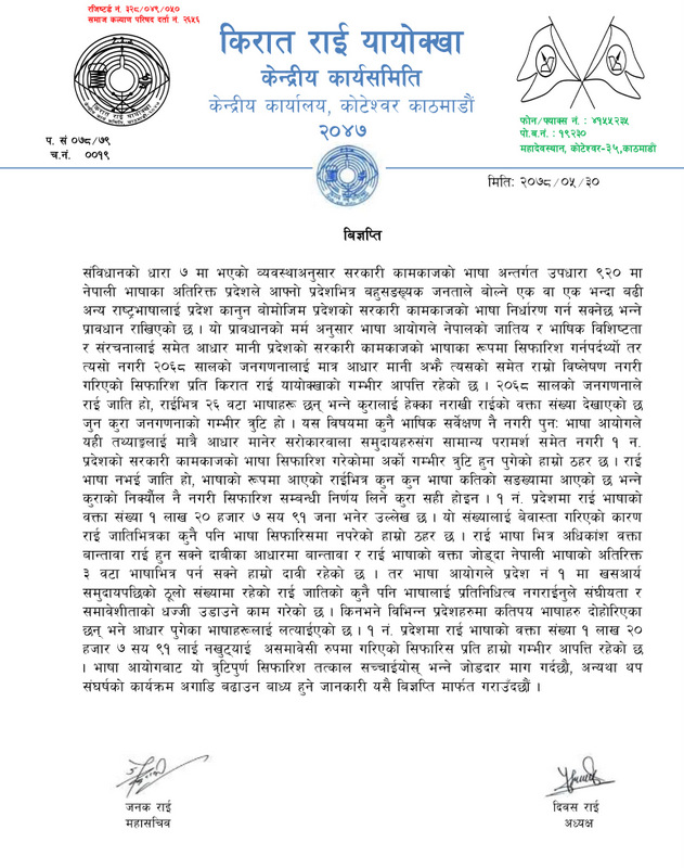 ‘१ नम्बर प्रदेशमा राई भाषाको वक्ता संख्या १ लाख २० हजार ७९१ जना भनेर उल्लेख छ । यो संख्यालाई बेवास्ता गरिएको कारण राई जातिभित्रका कुनै पनि भाषा सिफारिसमा नपरेको हाम्रो ठहर छ,’ विज्ञप्तिमा भनिएको छ, ‘राई भाषाभित्र अधिकांश वक्ता बान्तावा राई हुन सक्ने दाबीका आधारमा बान्तावा र राई भाषाका वक्ता जोड्दा नेपाली भाषाको अतिरिक्त तीनवटा भाषाभित्र पर्न सक्ने हाम्रो दाबी रहेको छ । तर भाषा आयोगले प्रदेश १ मा खस–आर्य समुदायपछिको ठूलो संख्यामा रहेको राई जातिको कुनै पनि भाषालाई प्रतिनिधित्व नगराइनुले संघीयता र समावेशिताको धज्जी उडाउने काम गरेको छ । किनभने विभिन्न प्रदेशहरुमा कतिपय भाषाहरु दोहोरिएका छन् भने आधार पुगेका भाषाहरुलाई लत्याइएको छ ।’