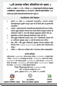 बुङ्वाखाद्वारा आयोजित २०औं बान्तावा कविता प्रतियोगितामा सहभागीको लागि कार्तिक २४ गतेसम्म समयसीमा रहेको छ । बुङ्वाखा २०औं वार्षिकोत्सवको अवसरमा आगामी मङ्सिर २३ र २४ गते भोजपुरको हतुवागढी गाउँपालिकामा सो प्रतियोगिता हुने भएको हो । हतुवागढी महोत्सव २०८१ र बुङ्वाखाको संस्थापक संरक्षक स्व. तिलक वालाहाङको स्मृतिमा कार्यक्रम आयोजना गर्न लागिएको हो ।